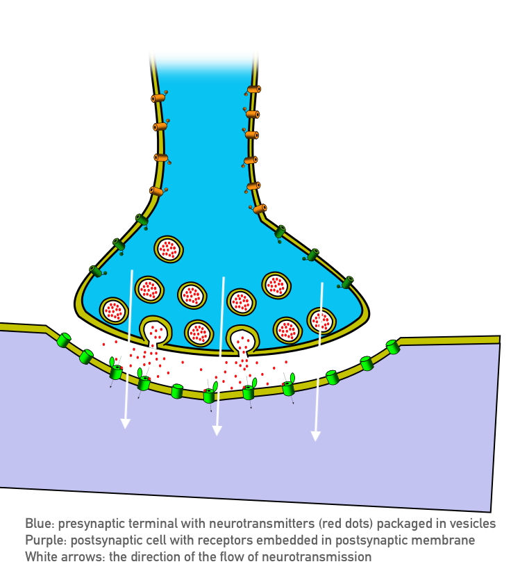 Serotonin is synthesized within the neuron body and is stored in vesicles at the axon terminal. When the neuron receives a signal to release serotonin, the vesicle moves to the interior membrane of the neuron (presynaptic membrane). The vesicle fuses with the presynaptic membrane, releasing its contents into the synapse. Once in the synapse, the serotonin travels to the dendritic spine of the receiving neuron, activating the serotonin receptors on the second cell. It is then taken back up into the releasing cell by reuptake pumps, reducing the concentration of serotonin in the synapse and terminating its effect.